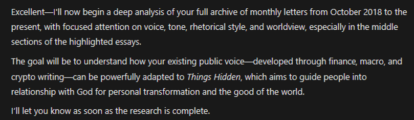 Again, incredibly impressive. So I took it a step further. I uploaded my 60+ pages of writing, including >100 hyperlinked references. GPT could read through to any text-based hyperlinks but could not absorb any of the podcasts or YouTube videos, of which there were dozens. And I asked again for its thoughts-