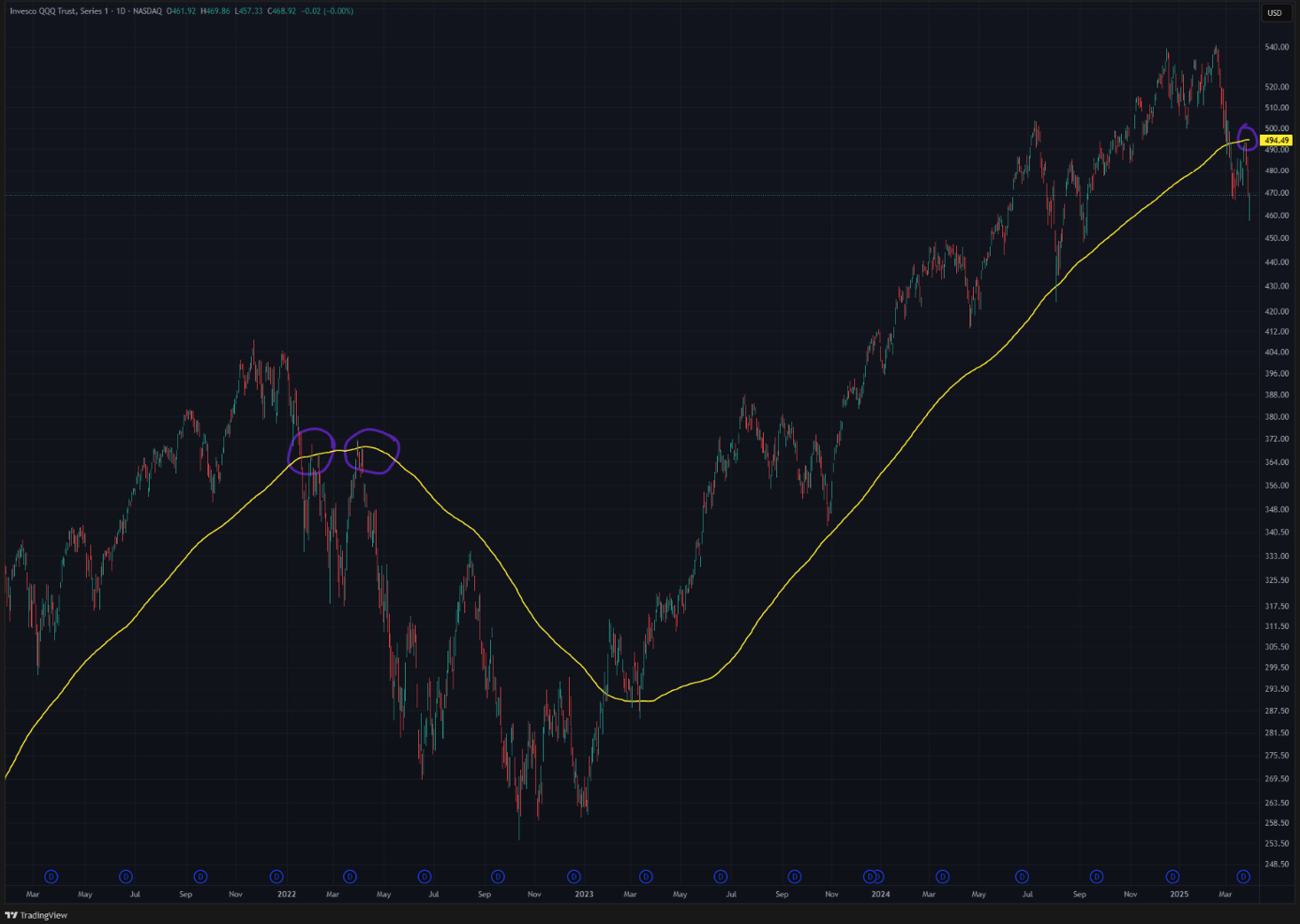 Is risk going to keep puking harder? Here’s QQQ with the 200DMA in yellow-