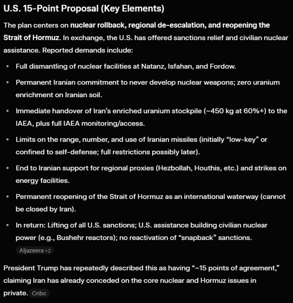 Despite significant fog of war, we do seem to have a pretty good sense of what the main points of negotiation look like. The below overview has been reported by many large news outlets globally and referenced by both Trump and Rubio-