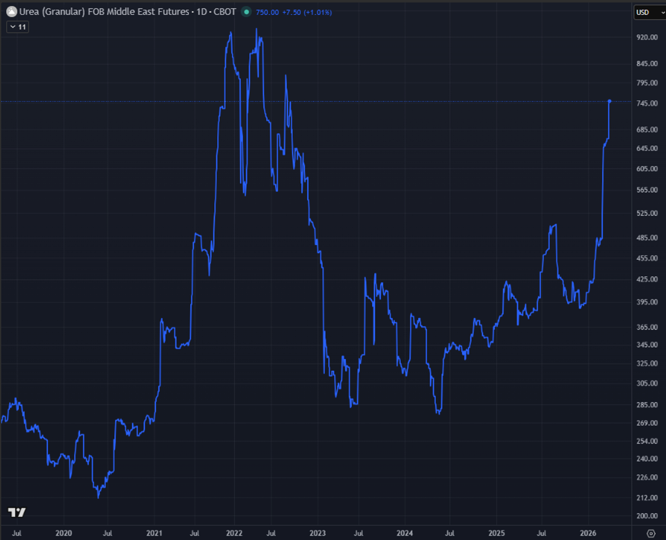 Front-month Middle East Urea was up >50% -