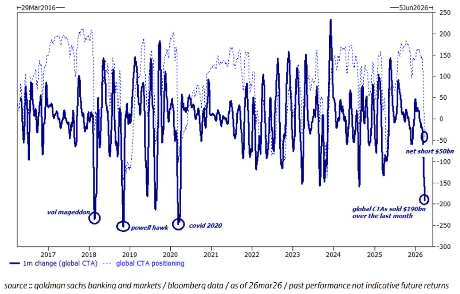The chart below got a lot of airtime a couple days ago. This is CTA positioning estimates from Goldman as of 3/29-