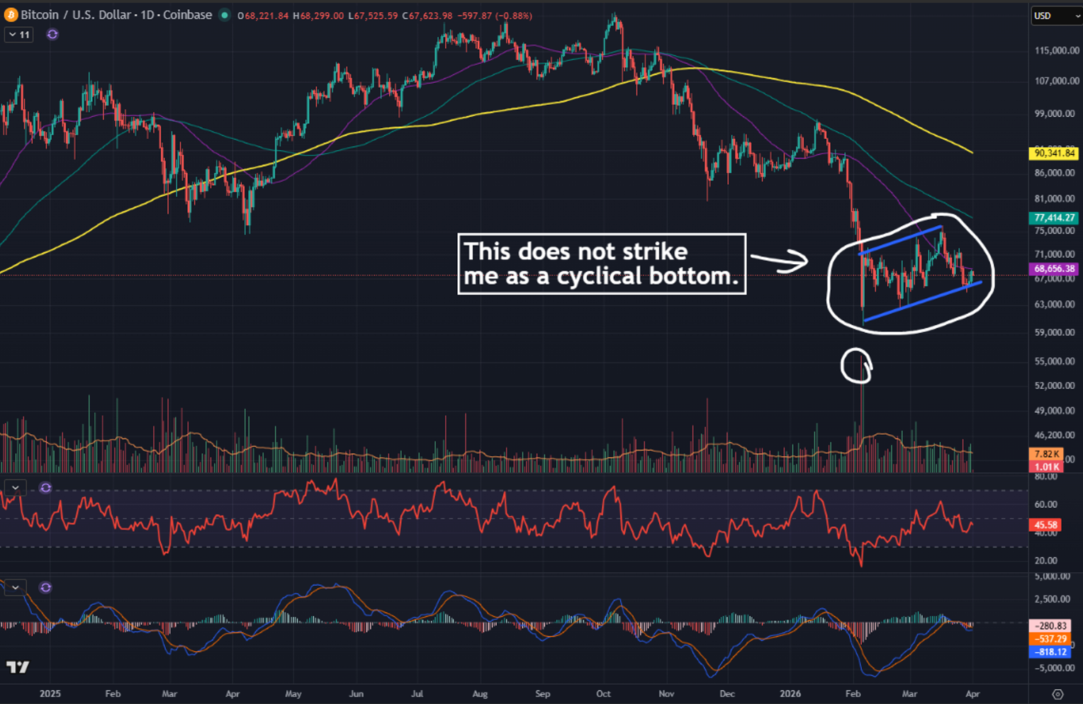 That whole structure in the big white circle is kinda gross and really does not look like major bottom to me. You could call it bear pennant (shown in blue). It’s worth noting that Saylor’s STRC was the main buyer of BTC on that runup from $66k to $75k in the middle of that white circle. I will have to leave an explanation of STRC for another day, but if you want an overview – this is a great one.