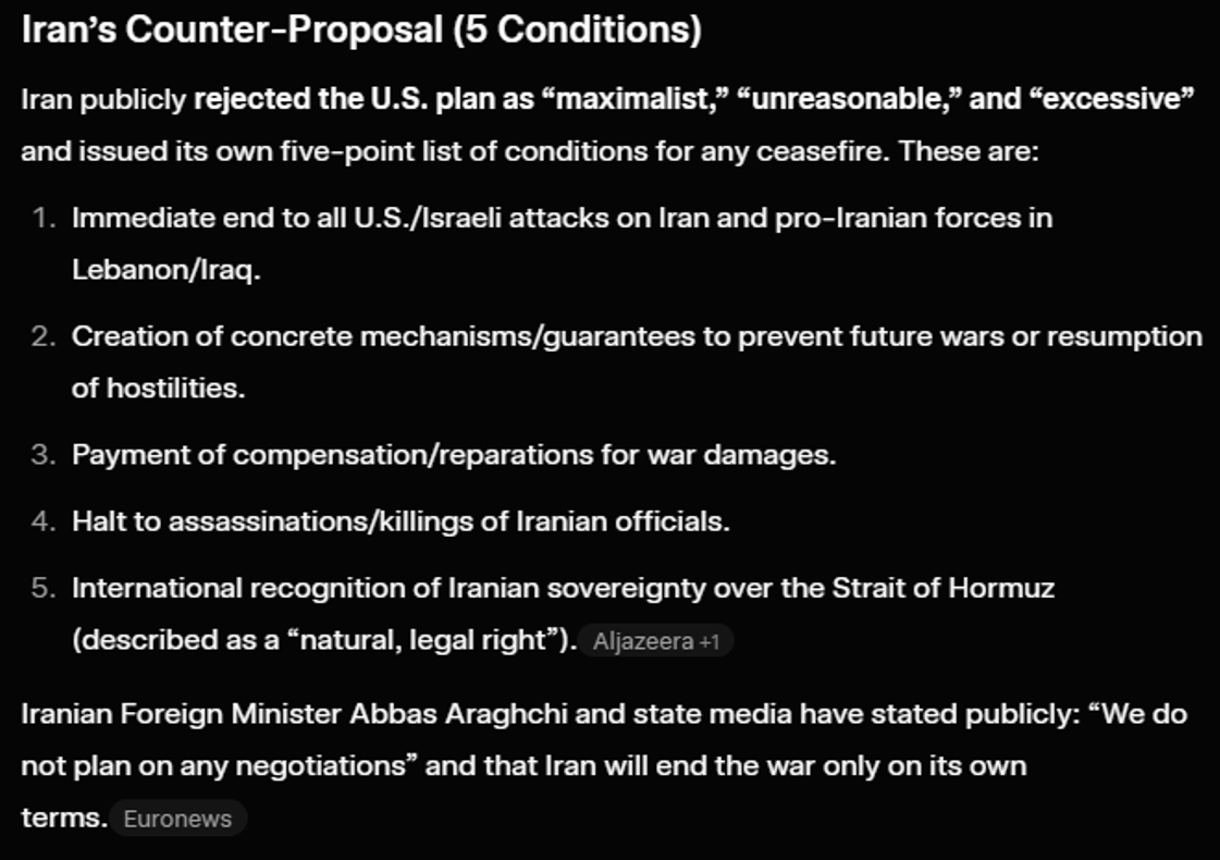 Point #5 there for Iran, this is the so-called “Tehran toll booth” idea that has been getting airtime recently. It is a major point of negotiation and as of 3/31, it has been firmly rejected by the US. On 3/30, Rubio called the Tehran Toll Booth “illegal, unacceptable, and dangerous to the world” and said Hormuz must open “one way or another”. So, it seems like this is going to be a major point of contention that needs to be settled.
