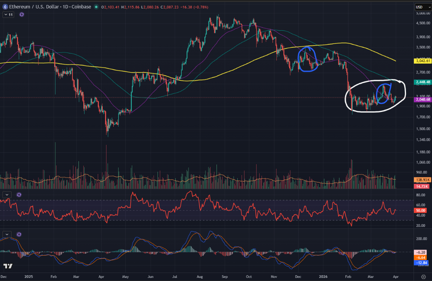 That rally we attempted in mid-March (blue circle) felt fake as it was happening. Then it collapsed all the way back down and you knew it was pretty fake. And with hindsight, that price action looks like the other blue circle back in mid-Dec. It seems ETH will need to go revisit the tariff lows at a minimum, sooner or later.