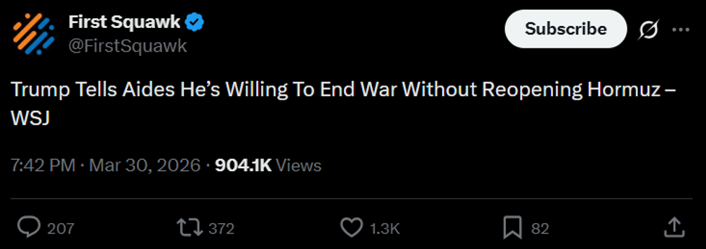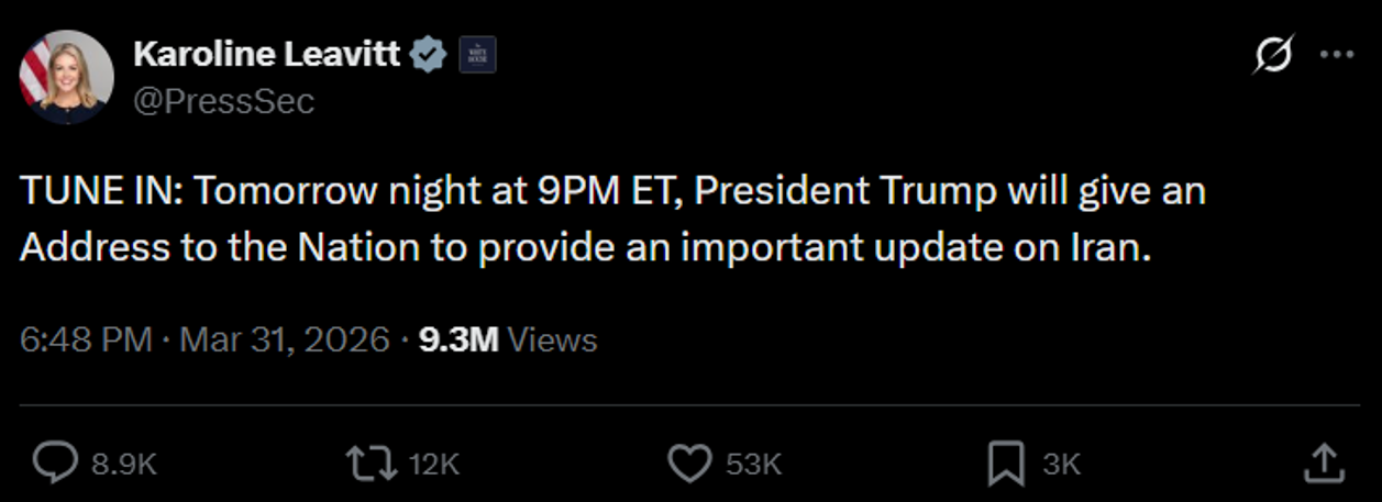So a lot of moving pieces in a very dynamic situation. My gut says this speech tonight is to calm and prepare markets for some kind of boots on the ground presence in the coming weeks by the US. He is going to tell everyone how good things are going and that we’ve accomplished all of our objectives, and that he is going to get help from Europe/NATO/GCC to secure the permanent reopening of Hormuz and that very soon everything is going to be great.