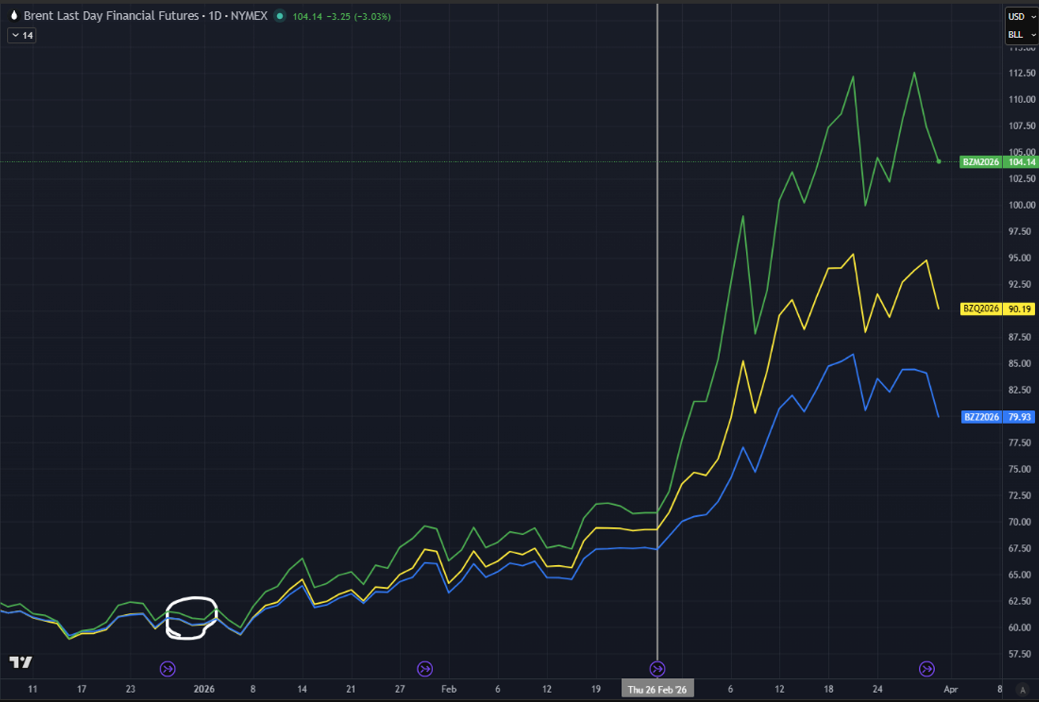 You’ll see we came into the year with a flat curve right around $60 (white circle). Oil creeped up from $60 to $70 over the next two months as the likelihood of an attack increased, and then at the vertical line, front month went from $71 to $112 in three weeks. Notably, August moved less, from $69 to $95. And December moved less still, from $67 to $85. It is noteworthy that as of 3/31, the oil charts look to be potentially topping.