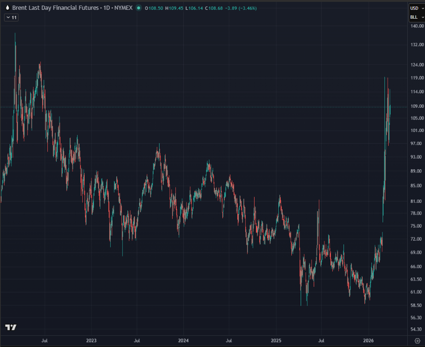 This caused historical levels of disruption in markets. Front-month Brent crude posted its largest monthly gain in history in March. The chart looks like this –