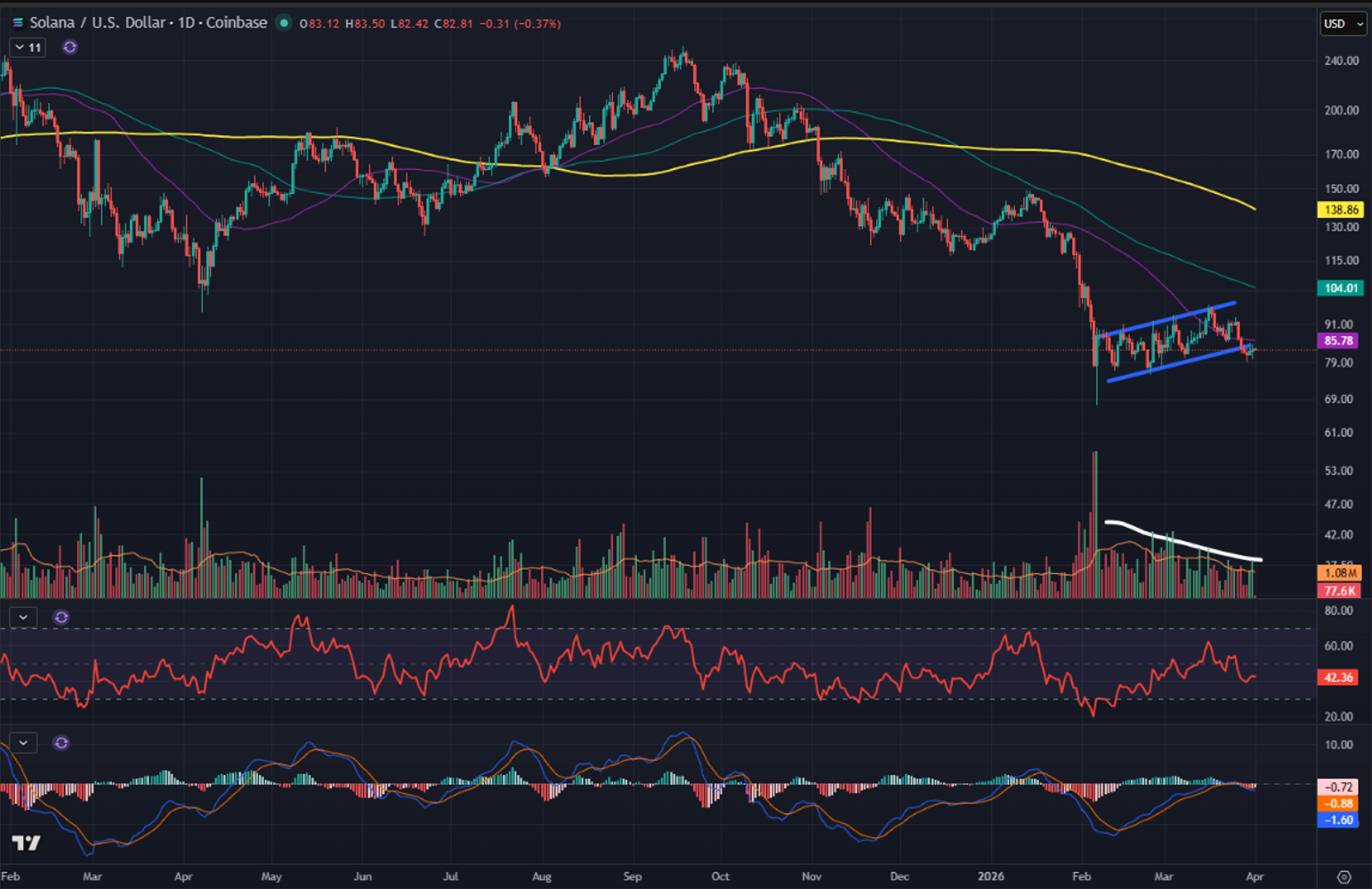 SOL looks the most cleanly bearish out of the three to me here. This looks like lower lows incoming-