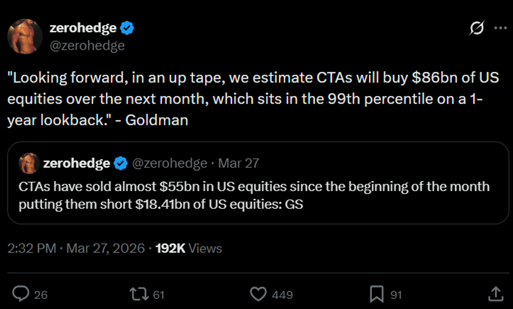 In the last few days of March, I have seen reports that various positioning has gotten quite lopsided. The tweet below is an example- CTA’s are likely at or near max short and will likely be buying equities in significant size regardless of what else happens in April-