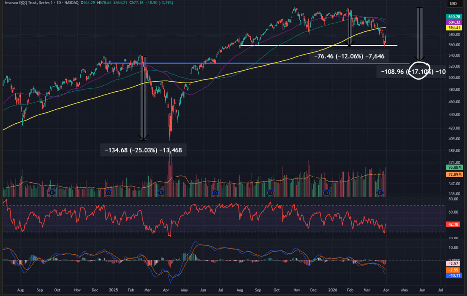 QQQ is now 12% off the highs, which isn’t really that much in the whole scheme of things. You’ll see that at the tariff lows last year, QQQ was down 25% from the highs. I doubt we get 25% from the highs this time unless we get a big escalation in Iran, which is possible but not my base case. I could see a path where 3/30 was the low, but my gut says we get one more leg down, and that blue line would make sense as a target from a TA perspective. It's easy for me to imagine the Iran backdrop that would cause price to go to that blue line, and then for that to be the low. It would be something like a significant ratcheting up of bombing war infra but also starting on some non-war critical infra. But then those actions bring Iran to the table and we get a deal. I think that scenario would make the chart go to the blue line and then bottom.