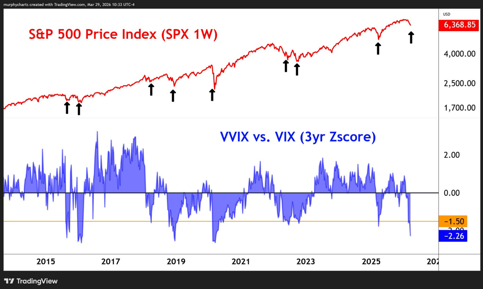 The VIX is the Volatility Index and the VVIX is the volatility of the Volatility Index. The chart below shows the ratio of the two-