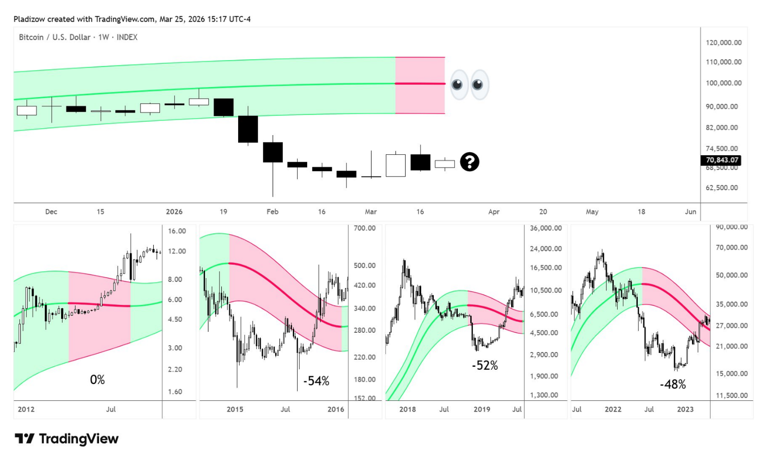 This is a pretty bad one for BTC. It shows previous instances where the weekly Gaussian Channel flipped red-