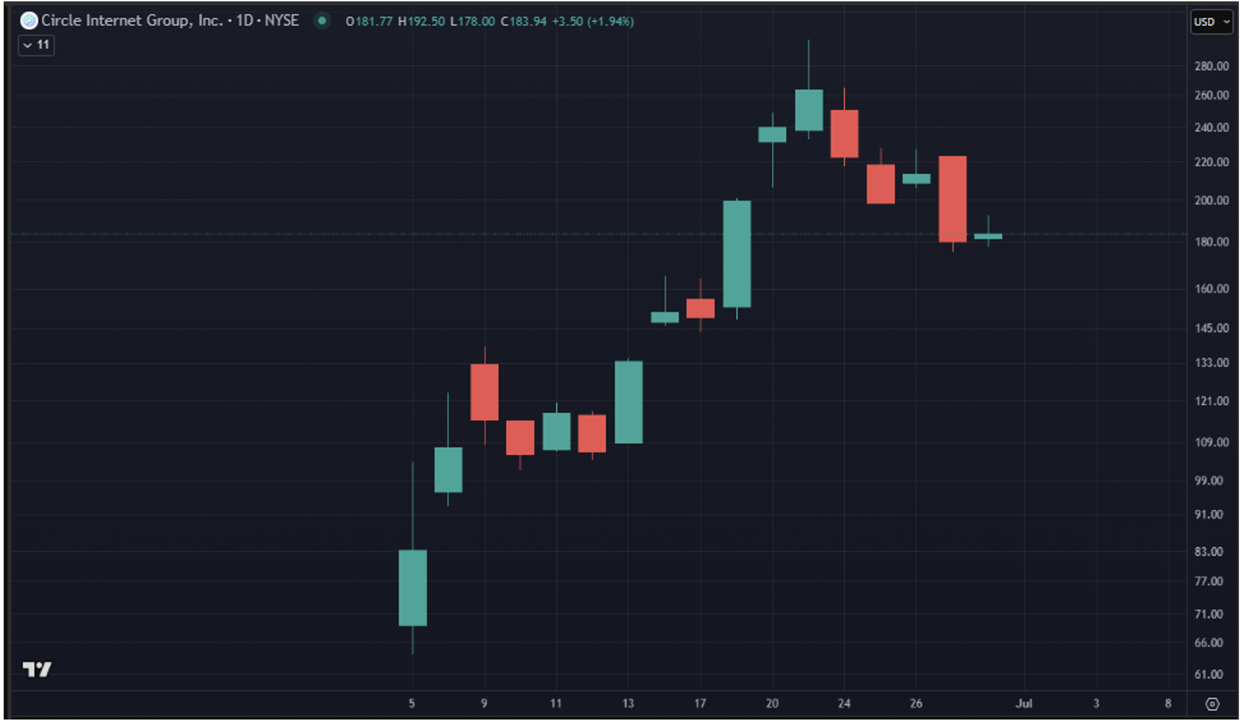 Now, the stock did pull back from its late June highs, closing out June at $180 – 40% off its peak. But that’s still +580% from the IPO price and +216% from day one closing price. Circle is currently valued at $58bn – that’s bigger than FedEx. Bigger than Aflac.