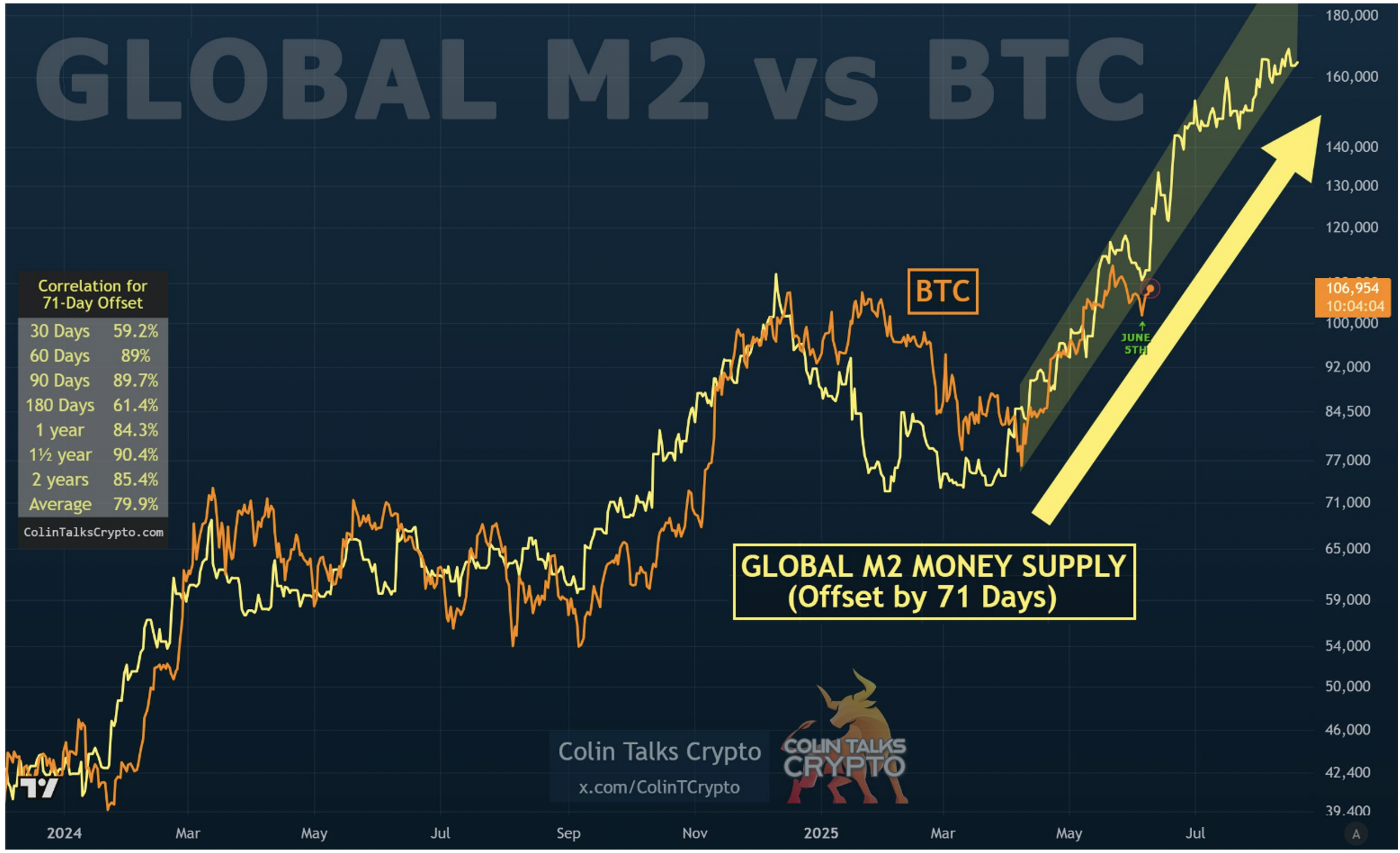 Global M2 has moved significantly higher in the last 4+ months. And when you lag that against BTC price (by 71 days in the above chart), it predicts BTC price will move considerably higher, starting immediately.