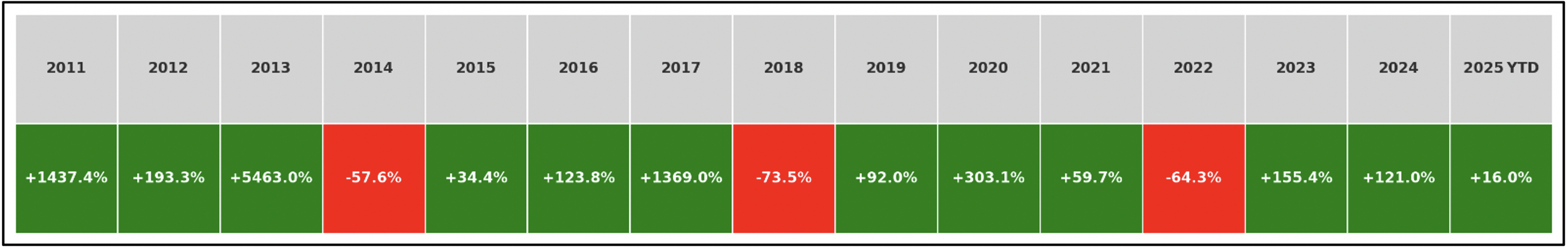 Bitcoin | 2% | 11% | 14% | -12% | 15% | 121% | 48% | 1% | -12% | 69% | 155% | -64% | BTC |