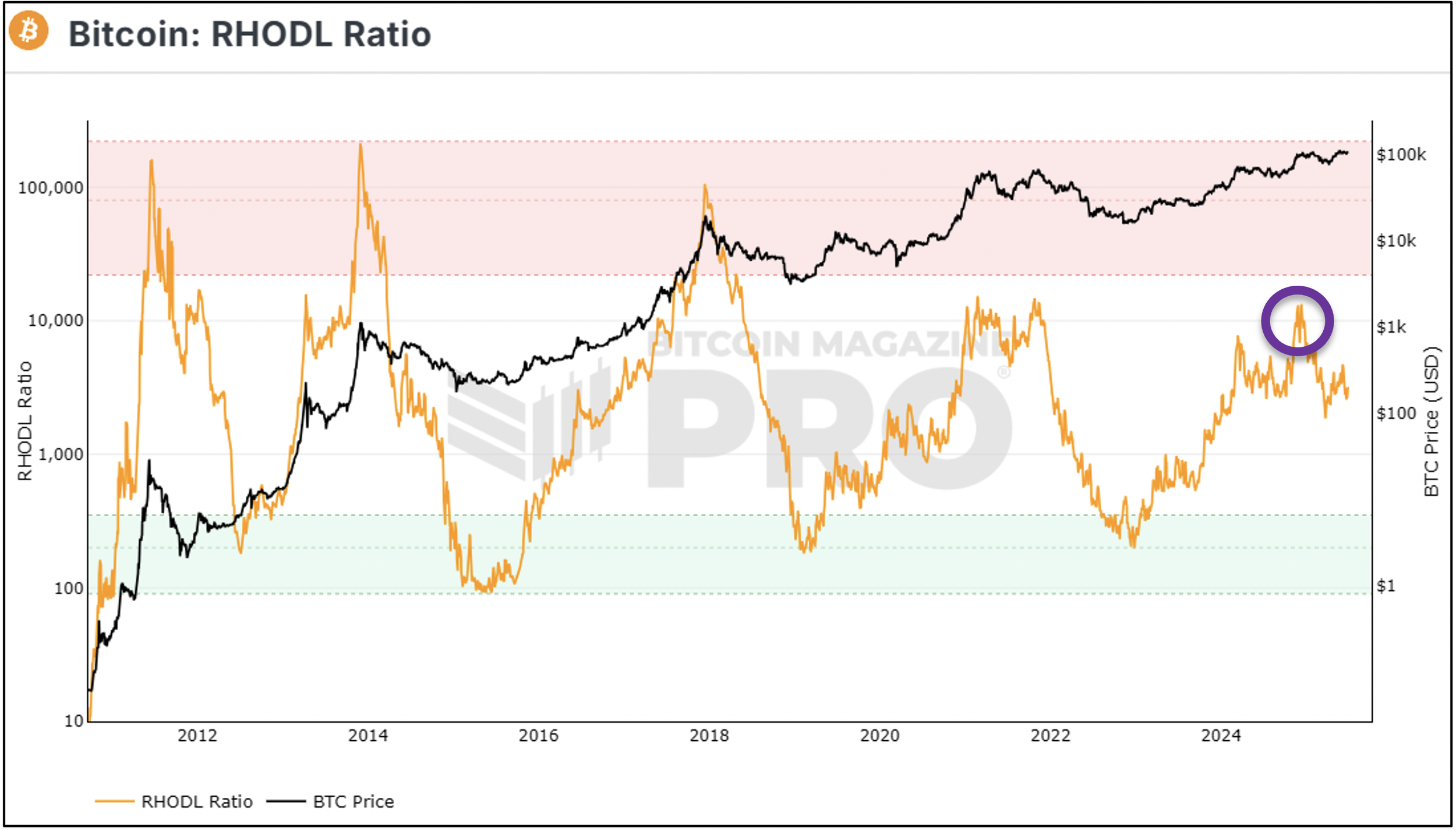 RHODL Ratio, which looks at the ratio between 1-week holders and 1-2 year holders, is a bit more alarming. In the Dec 2024 runup to $100k, RHODL did spike into the area where BTC price topped in 2021. That said, RHODL has pulled back a decent amount since then, and currently sits elevated but not super alarming. Again, I would not expect a blowoff in this metric. Could the pattern we’ve seen YTD in RHODL be a multiyear topping pattern, akin to 2021? Yeah maybe. But my base case would be that over the next 6 quarters, that orange line shown above will put in a pattern we haven’t seen on the chart before. My base case would be that it chops in the white part of the chart through 2026, not reaching the red or green areas.