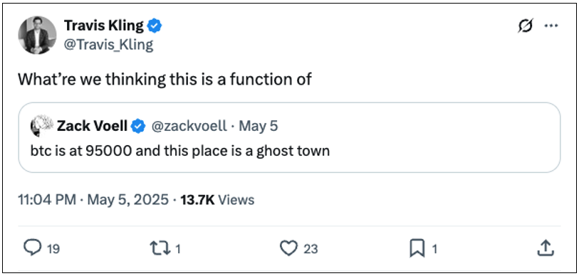 It remains to be seen how much longer we will need to churn this ~$100k level, with everyone that’s in the mood to sell over $100k getting rid of their coins to people that want to buy $100k. My guess is we will revisit sub-$100k again in 2025, and then we’ll see how the buying strength is down there relative to the selling. The good news is that this >$100k price action in May occurred without too much froth – funding rates and CME basis didn’t blow out and OI remained in a decent spot. So I think there is limited risk to a big leverage blowup if prices head lower from here. But we may need to continue churning around this $100k level for a while longer.