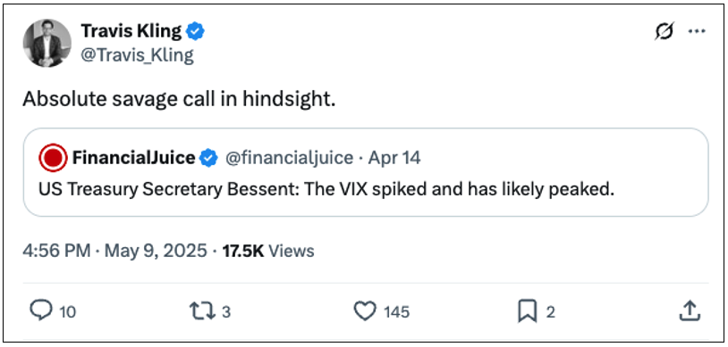 Overall, risk markets took the events of May very positively. SPX +6%, NASDAQ +9%, VIX -25%. NASDAQ closed May 4% off of ATHs. Treasury yields were up in May – US10Y went from 4.16% to 4.6% in a straight line the first three weeks of May, before tightening the end of the month and closing at 4.4%. Bessent needs yields tighter. For yields to get tighter, Bessent needs buyers of Treasuries.