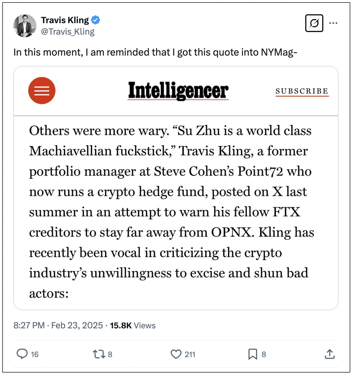 To that end, February was a pretty shit month. Also just a weird month. Bybit got hacked by North Korea to the tune of $1.4bn in ETH. Apparently that’s the largest heist of any sort in human history. Whoah. The Central African Republic launched and immediately collapsed a memecoin. Dave Portnoy launched and immediately collapsed MULTIPLE memecoins. Changpeng Zhao launched a memecoin about his dog that immediately collapsed. And then the crescendo (God willing) of this absurdity - Javier Milei launched a memecoin with some autistic crypto scammer no one’s ever heard of. That memecoin also collapsed in hours, the scammer made off with $100mm (and then did an interview talking about his crimes) and tons of people lost money. Milei is under investigation in Argentina for it. Kanye West thought hard about running the same memecoin playbook but backed out ON MORAL GROUNDS. Let that sink in.