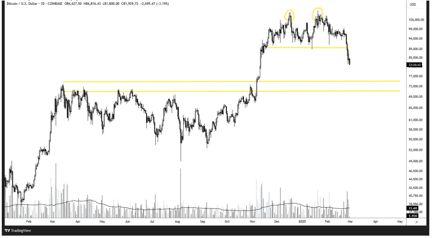 Low $70’s would make this the largest pullback since the FTX bottom, although still pretty light by historical BTC standards. In the last bull, we did an approximate double top (or failed breakout) that was spread across 10 months and had a 55% drawdown in between-