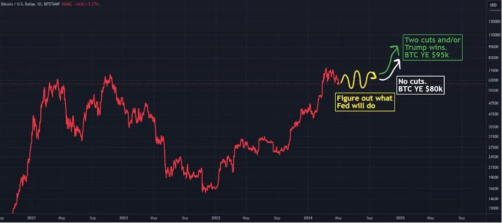 This ranging period over the coming months will give time for the Fed’s path to develop further and the market to decide how it feels about said path. As discussed earlier, there is a path of “No Landing” instead of Soft or Hard Landing, and there’s a path where NASDAQ trades well the rest of the year with that backdrop. Frankly I don’t know how to handicap that likelihood – it feels too new, too different. But I could see it happening. In a way, NASDAQ +15% and BTC +80% in a year where the Fed goes from 6 cuts to zero cuts, is an extension of a year where NASDAQ was +54% and BTC was +155% while the Fed aggressively raised rates.