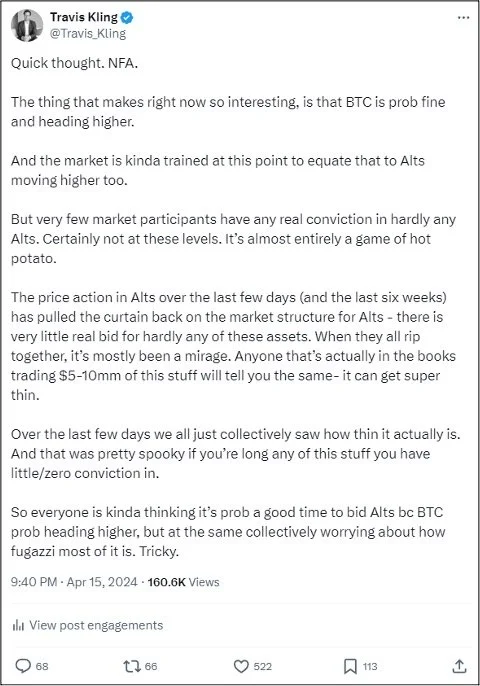 Overall, I would be worried about Alt performance this summer. If BTC chops I think Alts mostly bleed. There is no DeFi summer on the horizon. There is no NFT summer on the horizon. People have (mostly) made money and probably want to take the summer off because frankly there’s not much that I see that’s worth sticking around for. The points/airdrop narrative is dying. I think memecoins probably need a breather, although it’s easy for me to imagine some random memecoins pumping this summer because they’re incredibly manipulated.