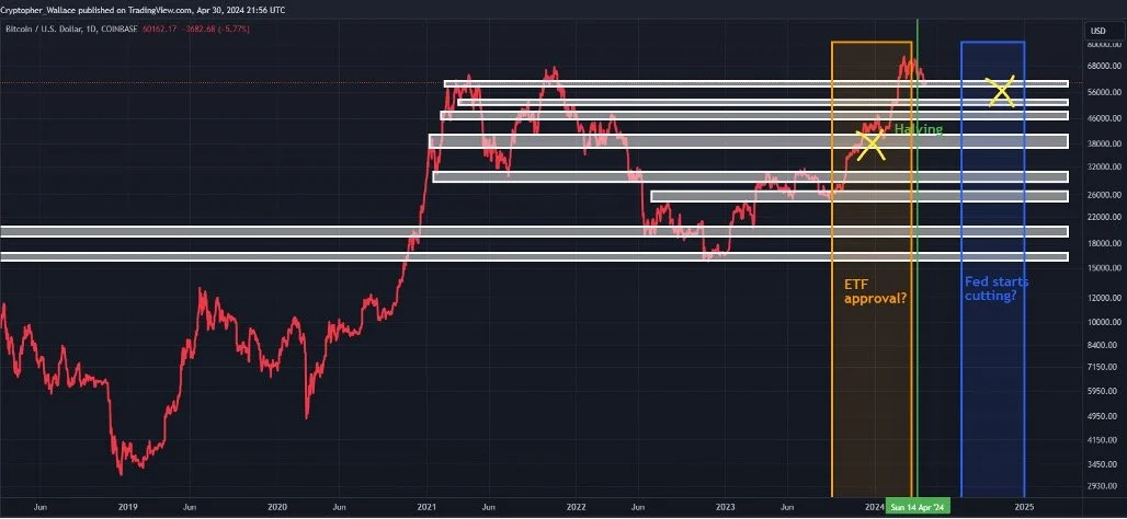 I’ve had those yellow X’s drawn there since September. You can see price front-ran the second yellow X by about seven months. We know why that happened – ETF inflows waaay outperformed expectations. I think part of that was because the market was expecting a Fed easing cycle to commence, and that’s a good reason to own BTC. Now that the Fed easing has been diminished and pushed out (or cancelled), I actually think that second yellow X is probably in play again. I think that would be my base case at this point – BTC ranges this summer $50’s to $70’s. That’s a pretty big range and if you’re in the mood to play it, go for it. But your time will likely be better spent touching grass with resting bids, or at least some price alerts.