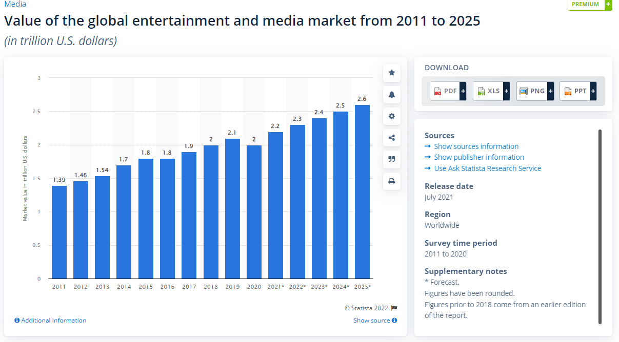 Consider the following. According to Statista, we are expected to spend $2.6 trillion U.S. Dollars on entertainment per year by 2025. I think this is on the low side given the changes that Covid-19 has brought to the world.